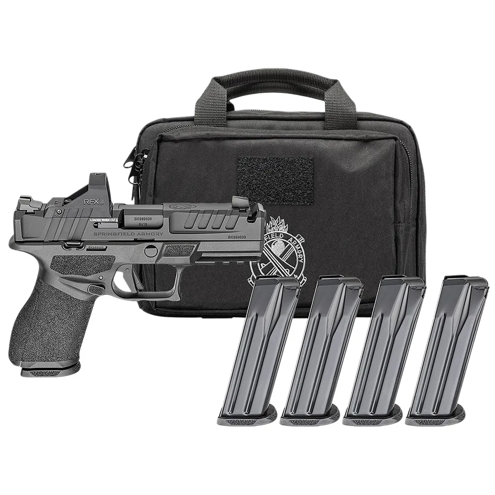 Springfield Armory EC9409BCOMP15PAC Echelon Comp Gear Pac 9mm Luger 15+1 4" Black Melonite Ported Barrel & Steel Integrated Compensator/Optic Ready/Serrated Slide, Black Polymer Frame w/Picatinny Rail, Textured Grip, Viridian RFX-11 Green Dot, Ambi