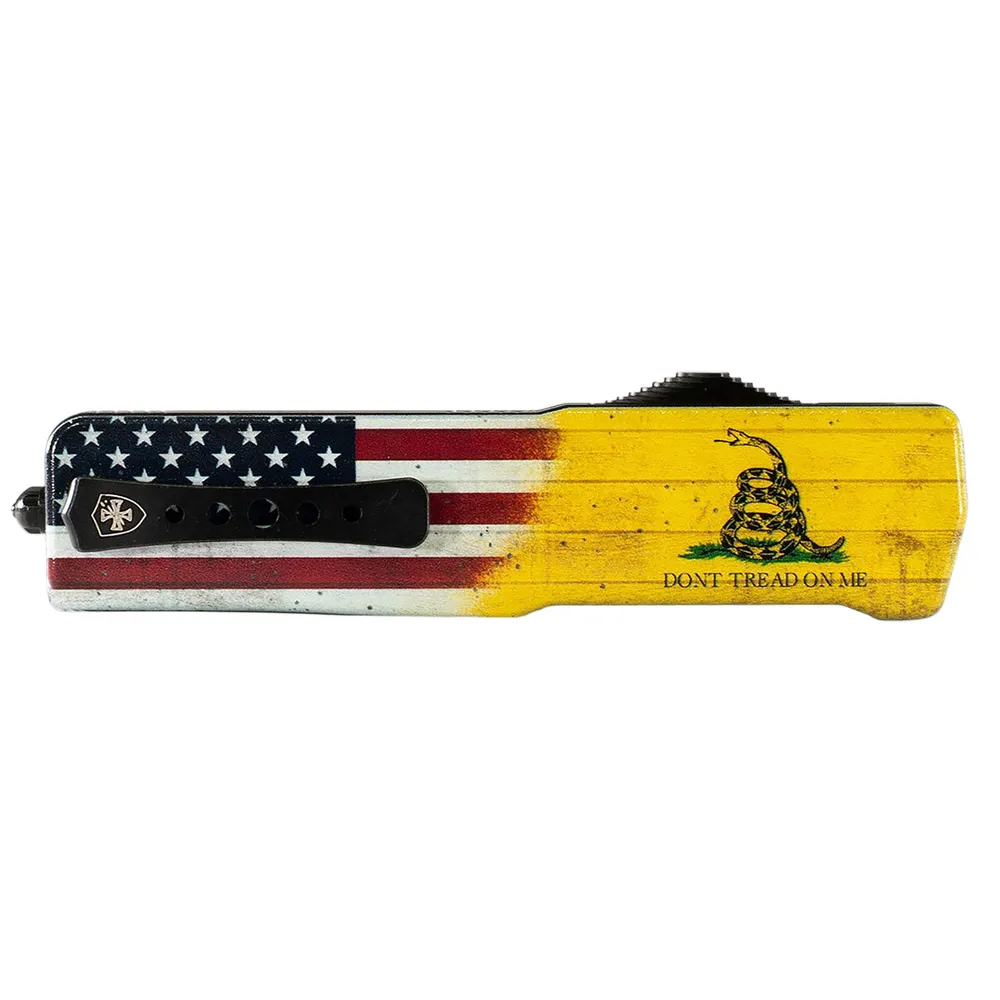 Templar Knife SZDTOM321 Premium Weighted Don't Tread On Me Small 3" OTF Drop Point Plain Black Oxide Stonewashed Powder Coated D2 Steel Blade, 4.50" Yellow w/Flag & "Don't Tread On Me" Aluminum Zinc Alloy Handle