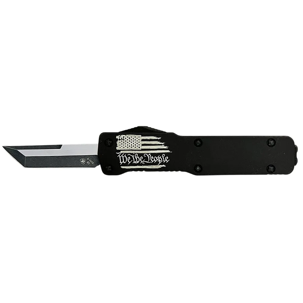 Templar Knife CAWTP221 Premium LW We The People Micro 1.85" OTF Tanto Plain Black Oxide Stonewashed Powder Coated D2 Steel Blade, 3.50" Black w/US Flag "We The People" Aluminum Handle, California Legal