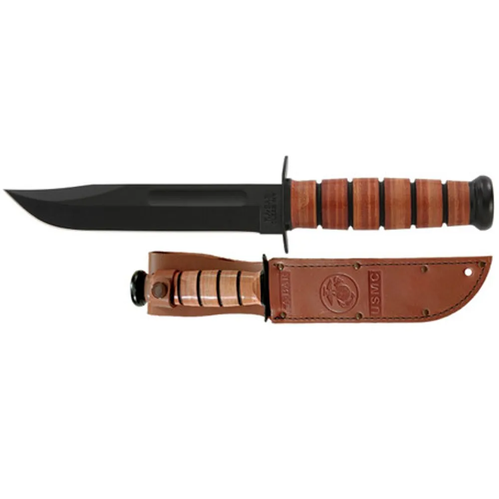 KA-BAR 1217 Full Size USMC Fighting Knife Fixed Blade 7" 1095 Black Clip Point Plain Blade, Leather Handles, Leather Sheath